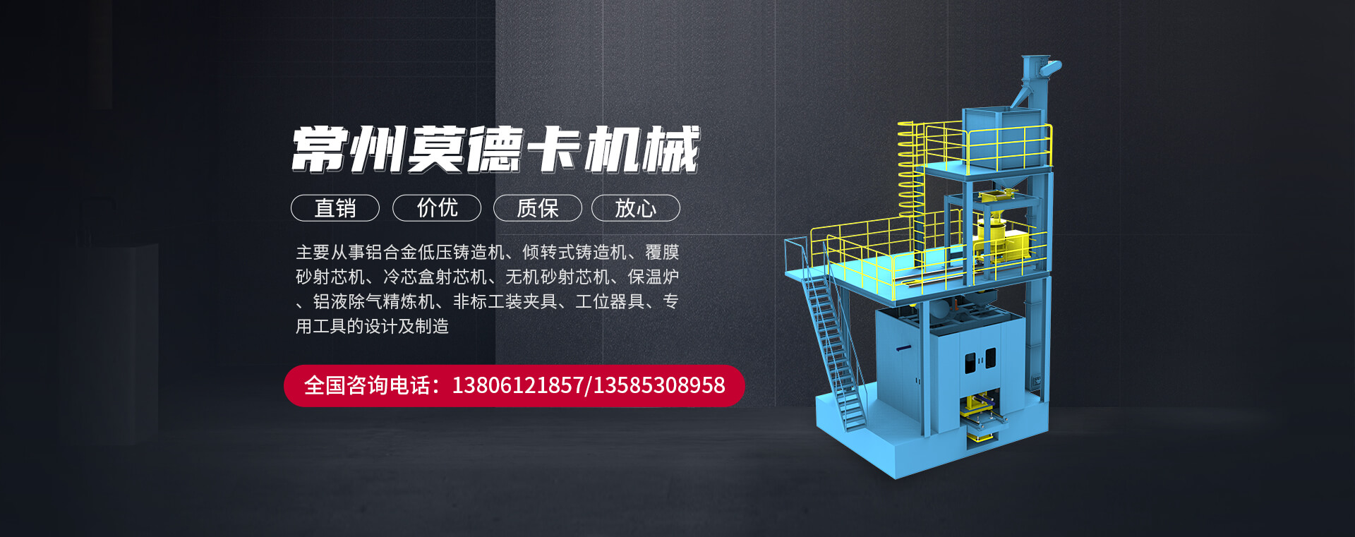 常州莫德卡機械有限公司坐落于經濟發達的長三角地區--江蘇省常州市新北區高新技術開發區。公司主要從事鋁合金低壓鑄造機、傾轉式鑄造機、覆膜砂射芯機、冷芯盒射芯機、無機砂射芯機、保溫爐、鋁液除氣精煉機、非標工裝夾具、工位器具、專用工具的設計及制造。公司成立于2015年5月,注冊資本500萬元,員工50多人,技術人在鋁合金和黑色鑄造產品開發方面具有深入的理論研究和豐富的汽車零部件制造經驗,集工廠規劃、工藝...